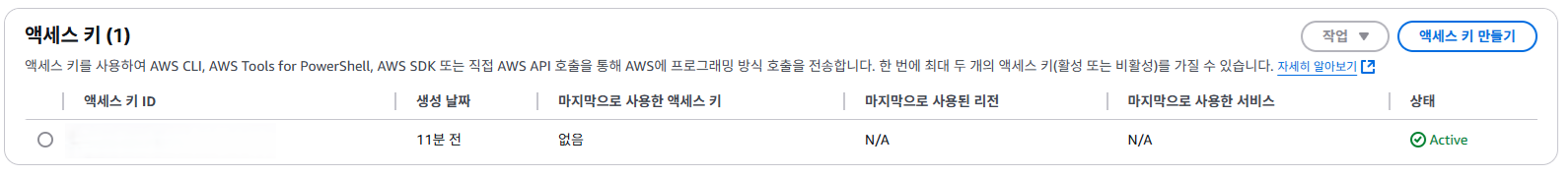 - 액세스 키 만들기를 통해 AWS Access Key ID와 Secret Access Key 생성
