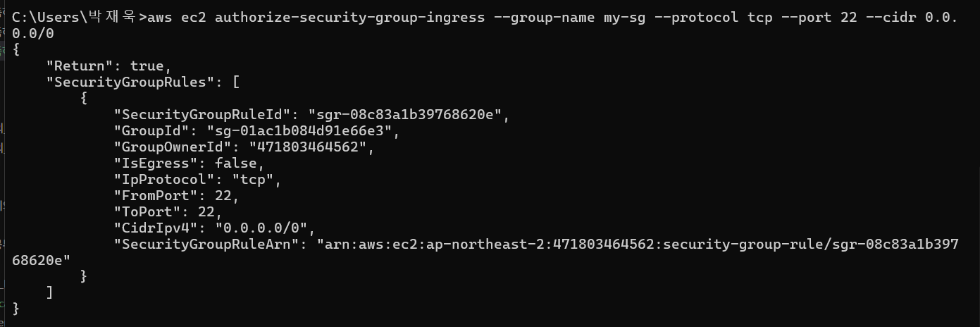 | aws ec2 authorize-security-group-ingress --group-name my-sg --protocol tcp --port 22 --cidr 0.0.0.0/0